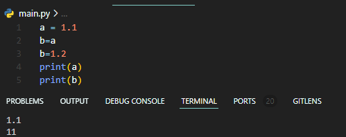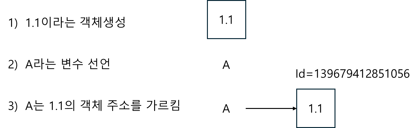 - 파이썬에서 변수를 선언하고 값을 할당할 때, 변수 a는 실제 데이터 1.1을 직접 저장하지 않습니다. 대신, 1.1 값을 가진 float 객체를 가리키는 주소를 저장합니다.변수는 그저 객체를 가리키는 이름 또는 레이블 역할을 합니다.