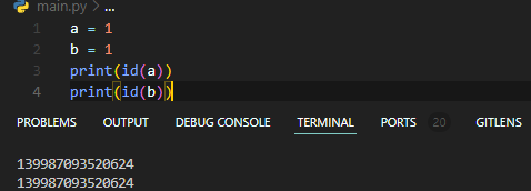 작은 정수 범위에서는 캐싱되어 동일한 메모리 위치를 가지는 경우가 있습니다. 이는 성능상의 이유로 작은 정수값들을 메모리에 미리 할당해두고 재사용함으로써 메모리를 절약하기 위한 것입니다. 따라서 a와 b가 같은 값인 경우에는 동일한 메모리 주소를 가질 수 있습니다.