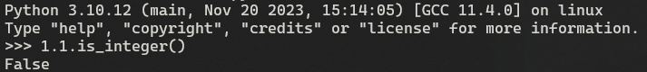 - 따라서 아래의 그림처럼 "1.1"이라는 실수 객체에 is_integer()라는 메소드를 통해 바로 결과값을 확인해 볼 수 있다는 뜻입니다.