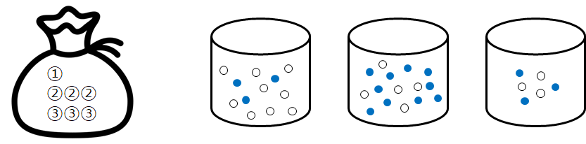 주머니에서 카드(1, 2, 3)를 1장 꺼내 번호를 확인 후 해당 번호의 병에서 공을 하나 색을 말한다.