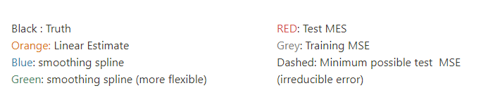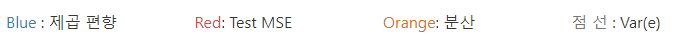 - 여기서 주황색과 녹색의 중간정도의 복잡성을 보여주는 파란색과 같은 경우는 Train MSE는 녹색과 비교했을 때 다소 높지만 Test MSE는 수평 점선에 가장 근접한 MSE의 성능을 나타낸다.