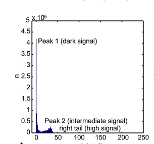 "추가적으로 Peak 1은 검은색 바탕의 영역을 나타내며, Peak 2는 뇌조직과 기타 조직, 주요 분할 포인트인 대뇌혈관은 Right tail에 구성되어 있는데 분포가 많지 않아 임계값 분할시 Peak 2에 포함되기 때문에 적절한 분할이 어렵습니다"