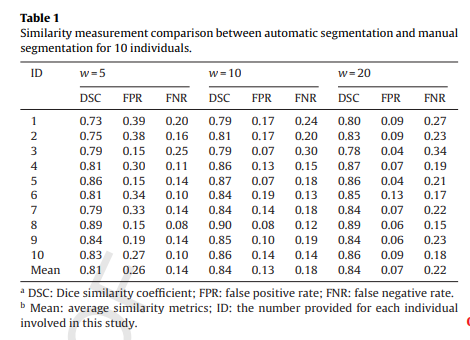 의료 영상 분할의 경우 DSC가 ≥0.7이면 자동 분할과 수동 분할이 매우 잘 일치함을 나타냅니다. 따라서 제안된 임계값 분할 알고리즘의 성능은 w의 넓은 범위(예: w ∈ [5, 100]) 내에서 수용 가능하다는 점을 알 수 있습니다.