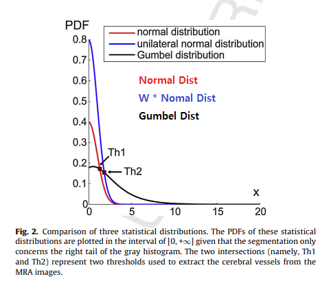 개인적인 의견으로 Gumbel과 같은경우는 극단값을 잘 표현해주는 분포 함수로써 대뇌 혈관의 시작점을 찾는데 용이하기 때문에 사용된 것으로 파악됩니다.