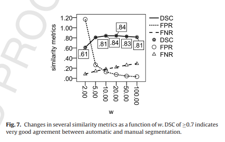 각각의 가중치 값인 w를 사용한 분할 결과 값인 DSC, FPR 및 FNR은 표 1에 요약되어 있습니다.