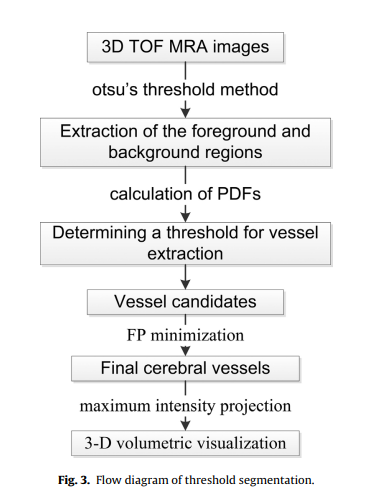 따라서 본 논문에서는 A threshold segmentation method was developed to extract cerebral vessels from 3-D TOF MRA images방법을 제안하였습니다.