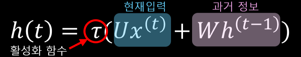- 아래의 수식처럼 현재의 입력과 과거의 정보를 더해 활성화 함수 탄젠트를 취해주는데, 함수는 값이 -1에서 1사이에 위치하게 됩니다.