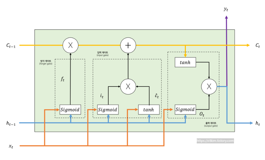 - 게이트는 입력게이트, 망각 게이트, 출력게이트로 이루어진다.
